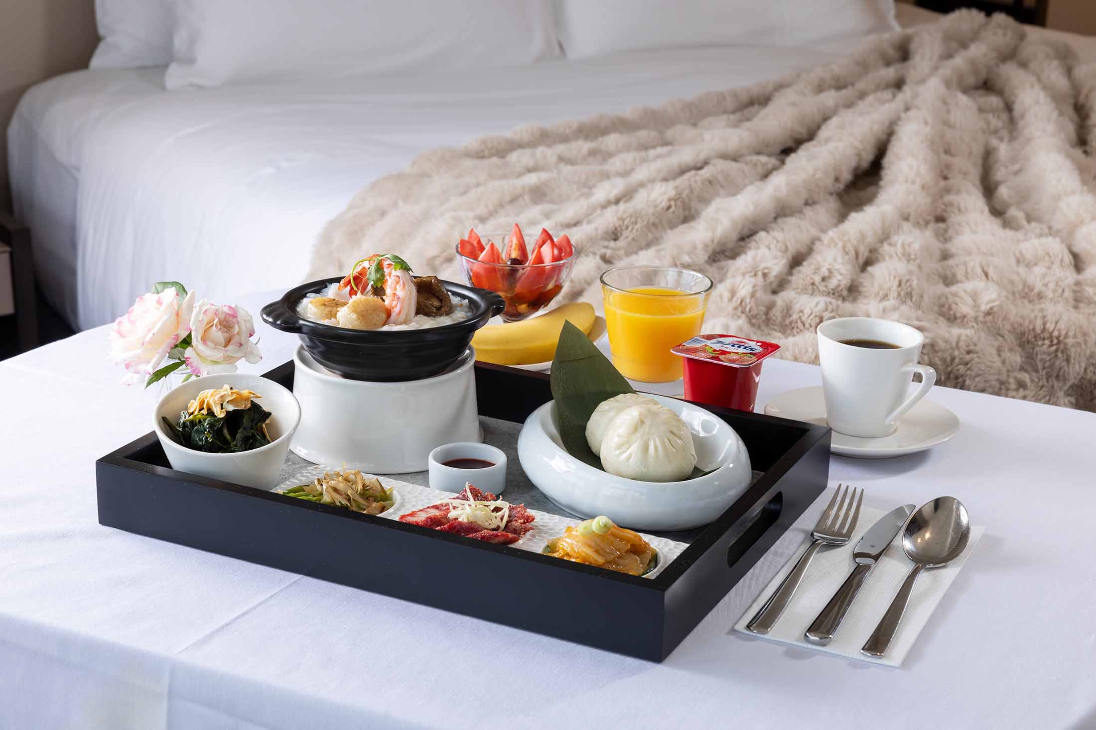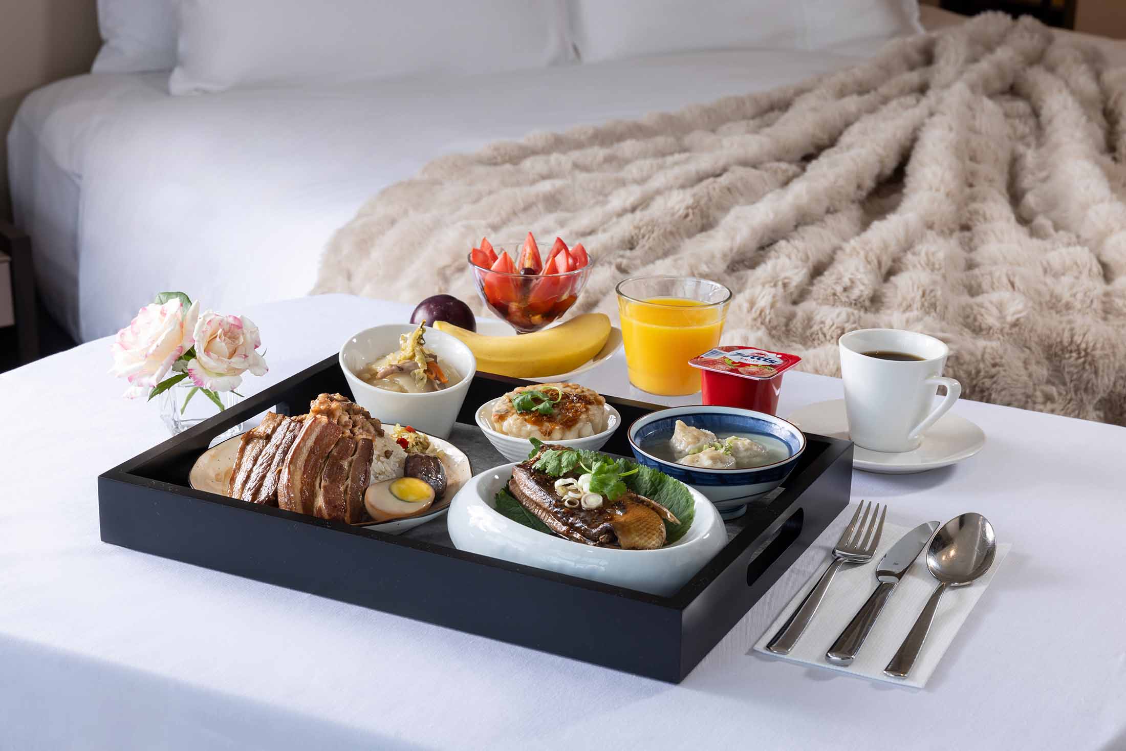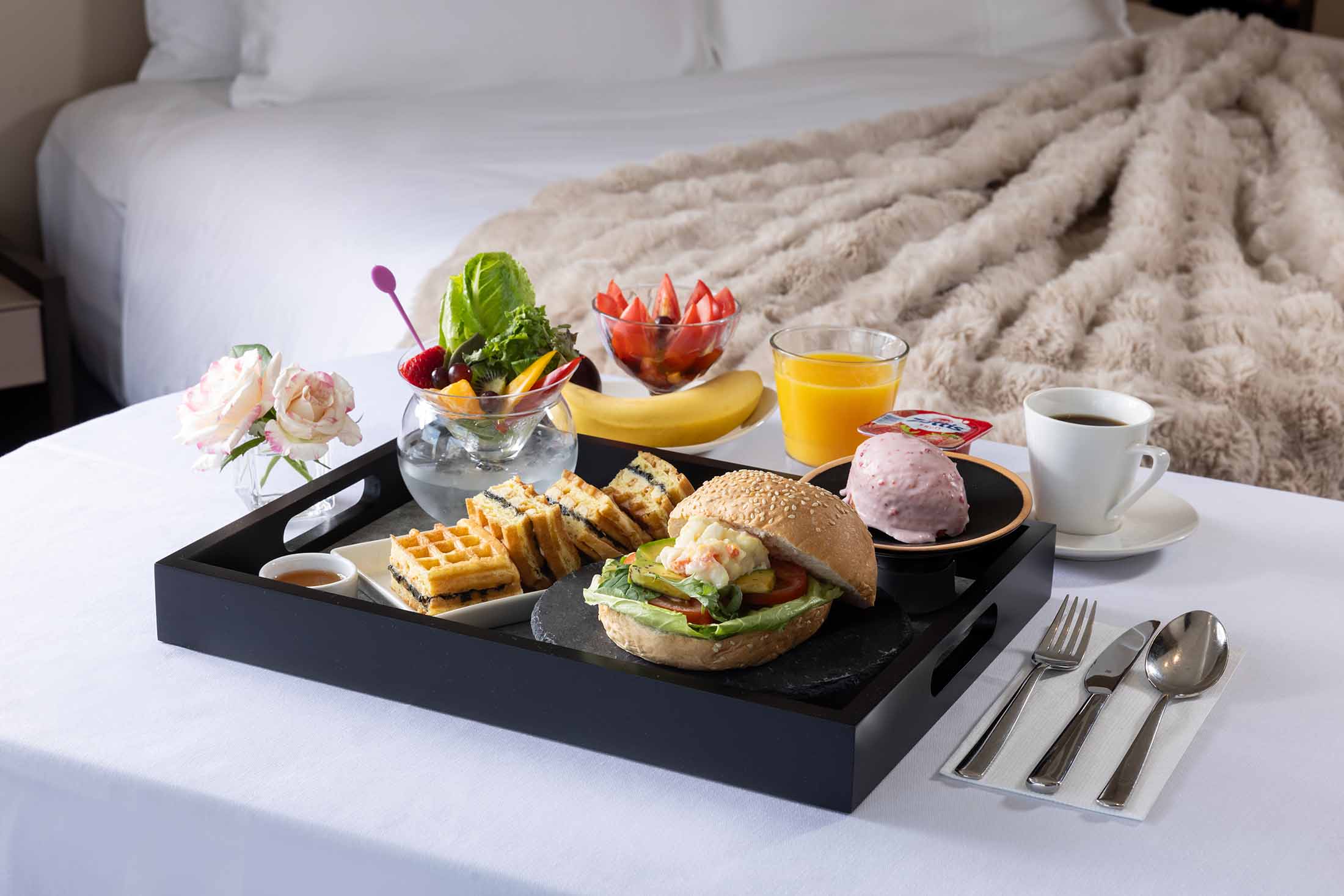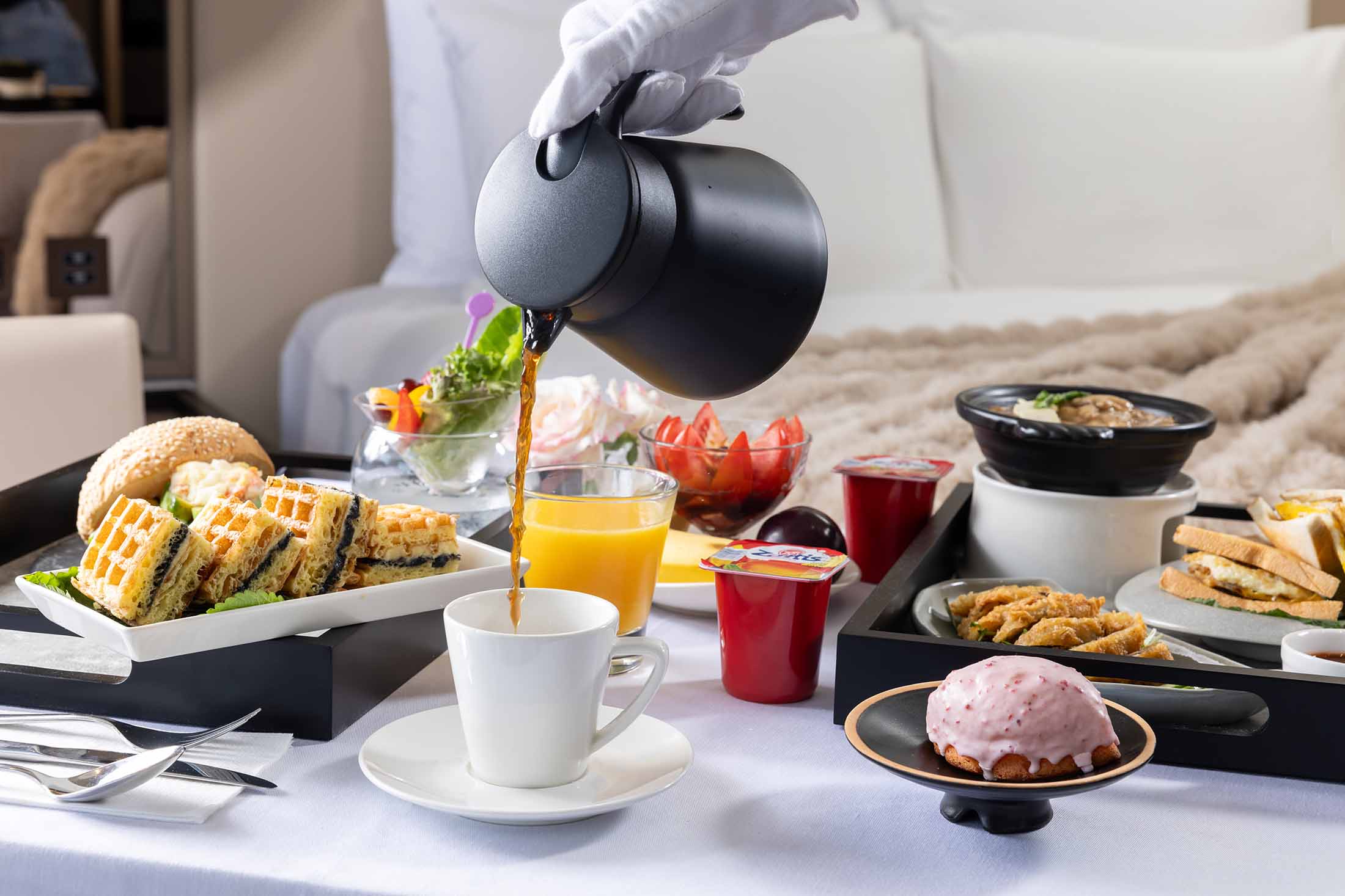 シェフが心を込めて丁寧に仕上げた特製朝食を、ワゴンに乗せて客室までお届けいたします。朝日を浴びながら、ゆったりとした朝のひとときをお楽しみください。